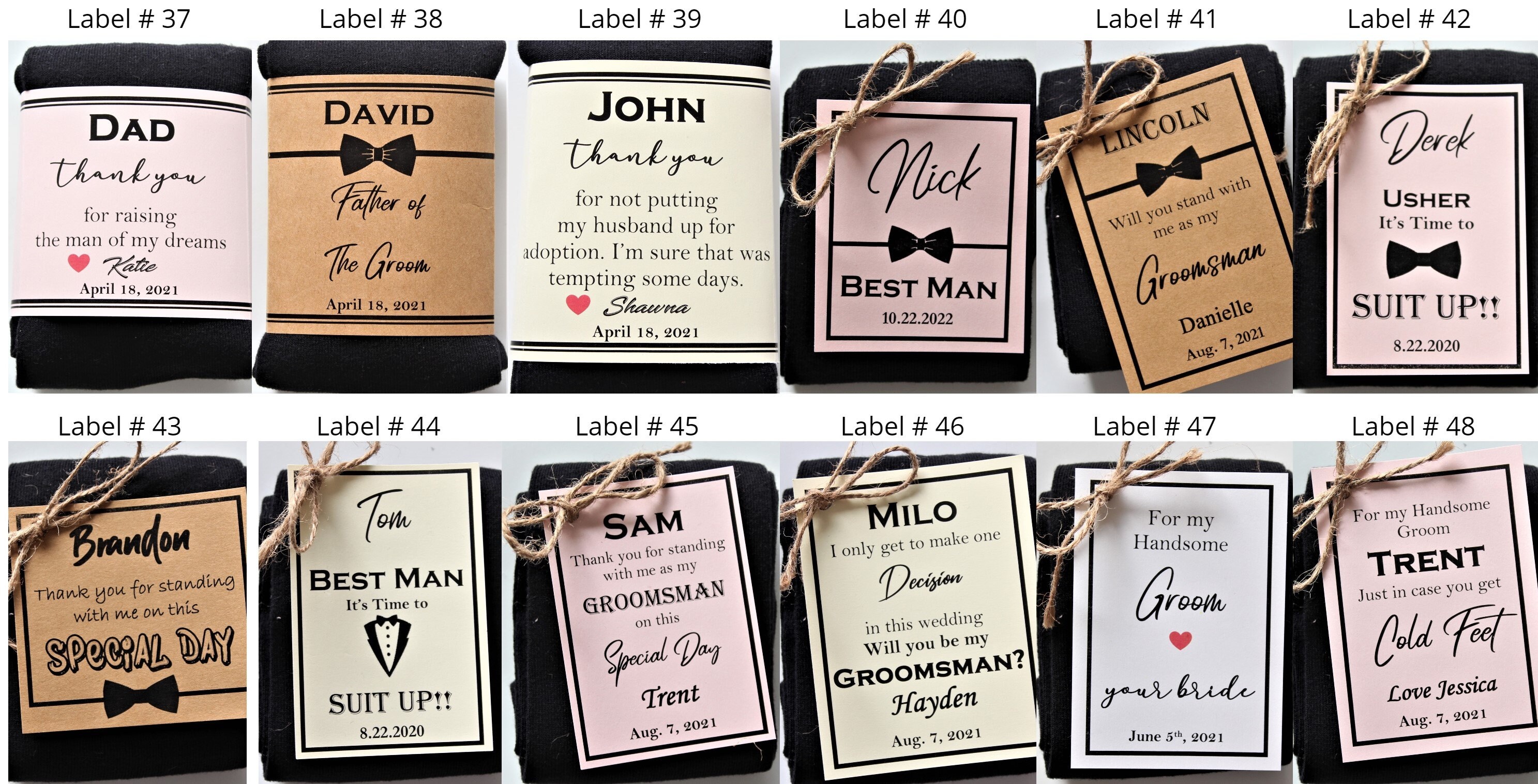 Free groomsmen sock labels. Will You Be My Groomsman? 30 Cool Groomsmen Proposal Ideas - The Knot Your groomsmen-to-be will feel like royalty from the moment they spy their names on the outer lid of this fancy proposal box by Established Co Gifts. Inside, there's a personalized pair of socks and a monogrammed drink koozie. There are lots of variations available for the insert card, so you can adjust the wording to suit your recipient. 73 Best Groomsmen Gift Box Sets in 2022 - Groovy Guy Gifts This classy combo is the perfect way to assemble your ultimate groomsmen squad while getting them looking the part. The boxes feature one pair of socks (with optional customized label), cuff links, a tie clip, and 'Time to Suit Up" insert all packaged in a kraft gift box and sealed with string. 49. Midnight Smoker Cigar Box Set "He Accidentally Stabbed Another Groomsman": People Are Calling Out The ... 7. "My older brother was a groomsman at my sister's wedding. He got embarrassingly drunk. There was also some woman who was the girlfriend of a guest, who I noticed was hitting on my younger brothers. Groomsmen Socks | Groovy Guy Gifts All labels can be done in colors: White, Kraft, Cream or Blush. There are 2 types of labels - Wrapped around socks or Tag that is tied with twine rope. Labels are printed on heavy superior quality paper and grooved to wrap perfectly around socks. You can mix and match different colors or designs. Par-fect Socks He loves playing golf.