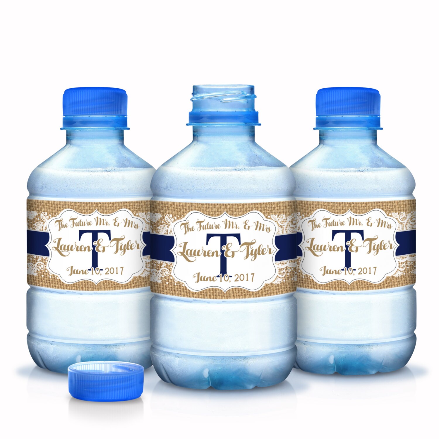 Personalized Burlap and Fancy White Lace Frame Wedding Water Bottle Labels Engagement Bridal Shower Wedding Party Custom